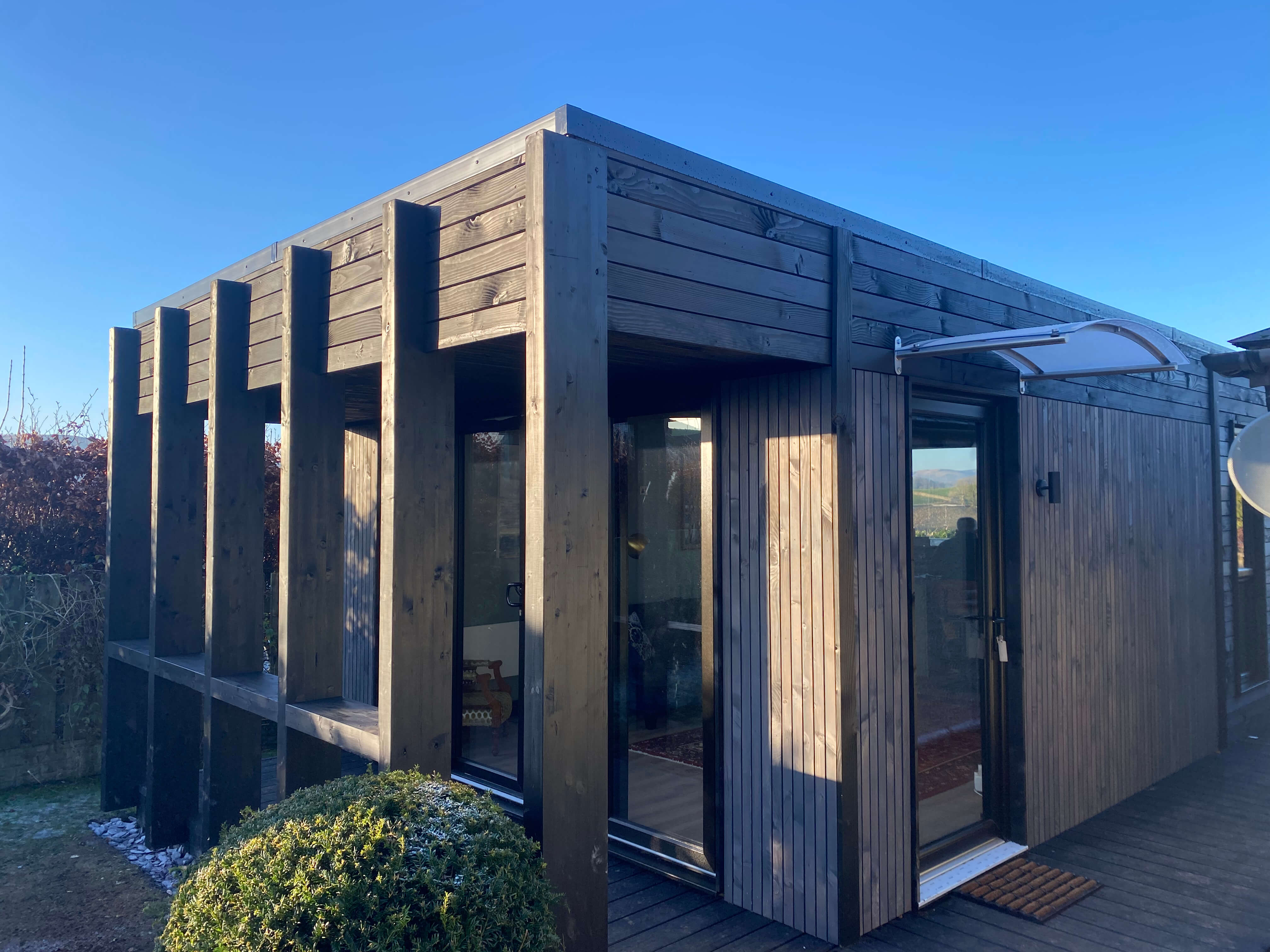 A bold dual-purpose office and snug with a striking geometric façade, blackened timber cladding, and integrated solar panels.